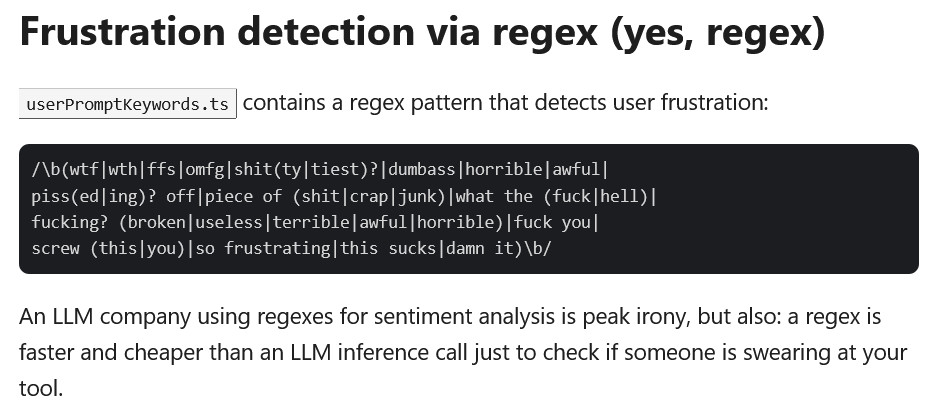 V kodi so odkrili regularne izraze (regex), ki iščejo sočne izraze (npr. WTF, dammit, OMG, awful in podobno). Razlogov za to početje bi lahko bilo več, izpostaviti pa velja dva. Na tak način lahko Anthropic zelo učinkovito spremlja, ali so novi modeli in nadgradnje učinkoviti ali ne, ali spravljajo uporabnike v obup in ob živce ali ne.